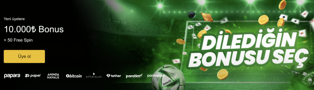 Bets10, yeni üyelere özel hoş geldin bonusu sunar. Bu bonus, zaman zaman kampanya dönemlerine göre değişiklik gösterebilir. 2025 yılı itibarıyla sunulan bazı örnek bonuslar şunlardır: