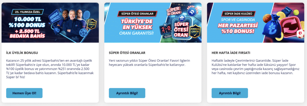 25 yılı aşkın süredir online bahis alanında hizmet veren Süperbahis canlı bahis sitesi, yenilenen yüzü ve yüksek bonus miktarları ile kuşkusuz en iyi bahis siteleri arasında ilk 3 ‘de yer alıyor. İlk üyelik bonusu olarak 10.000 TL ‘ye kadar %100 bonus sunan site, aynı zamanda 2.500 TL ‘lik de ek Bedava Bahis bonusu sunmaktadır.